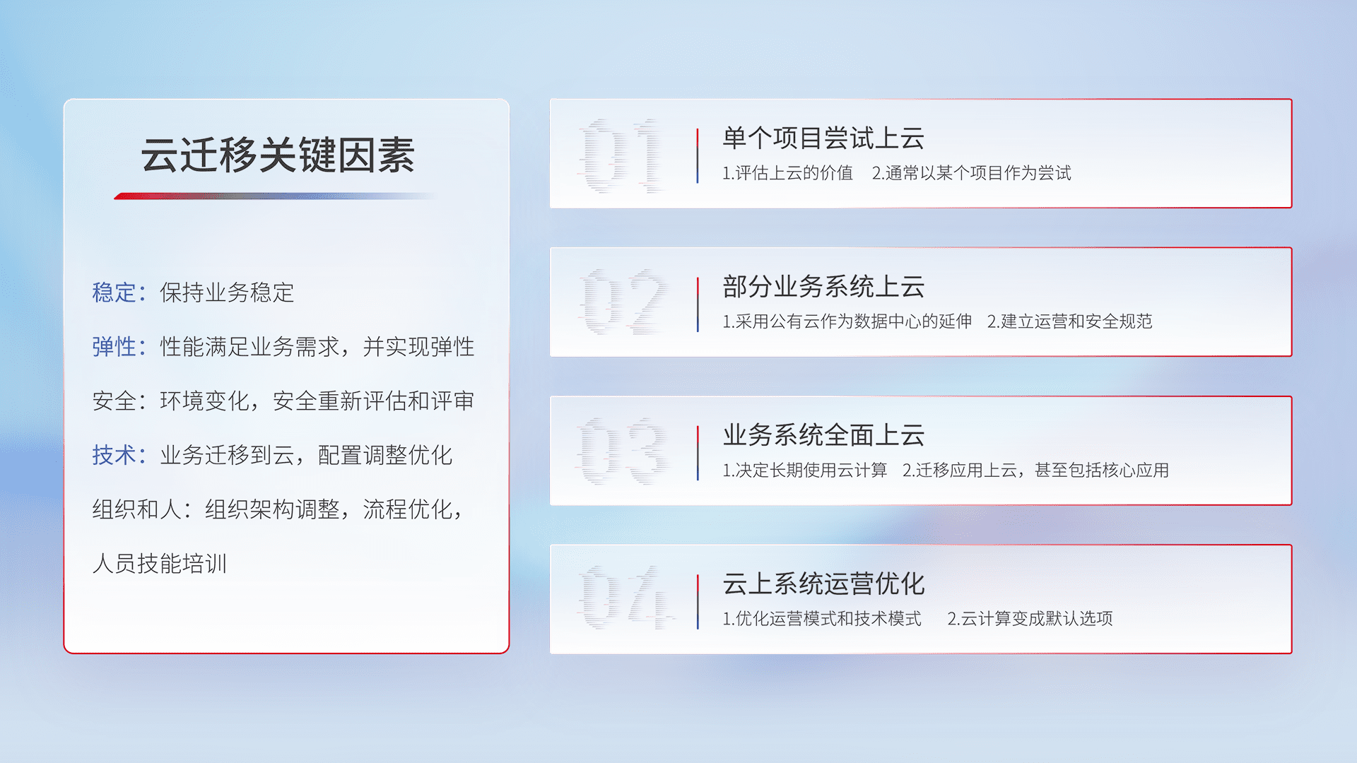 结合实际业务,,从规划设计、、云平台选型、、云原生改造、、、数据迁移、、集成交付,,,迁移全过程为客户识别最佳上云路径,,做好风险识别管理,,设计网络架构、、身份权限、、、安全审计合规、、操作审计、、日志审计、、监控告警策略、、、、多站点容灾设计等,,,对云上基础设施进行整体规划,,,提升IT治理水平,,,以满足弹性、、、高可用、、、、高性能的需求。。。